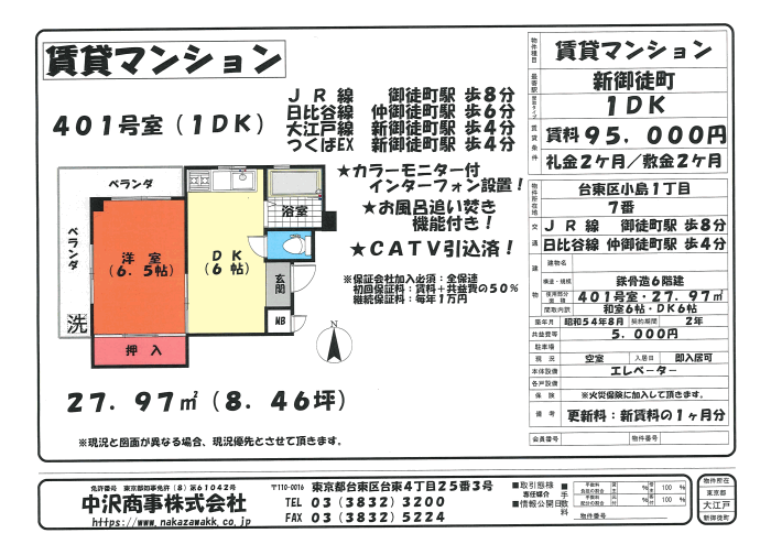 1DK | 95,000 | 5,000 | 礼2ヵ月 敷2ヵ月 |